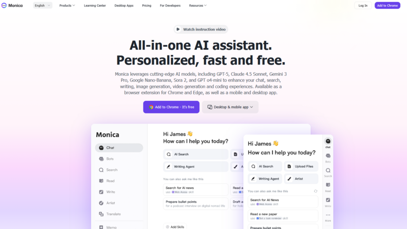 If you want AI directly in your browser for quick summaries and rephrasing, Monica is a reliable selection. However, it doesn't offer robust creative tools.